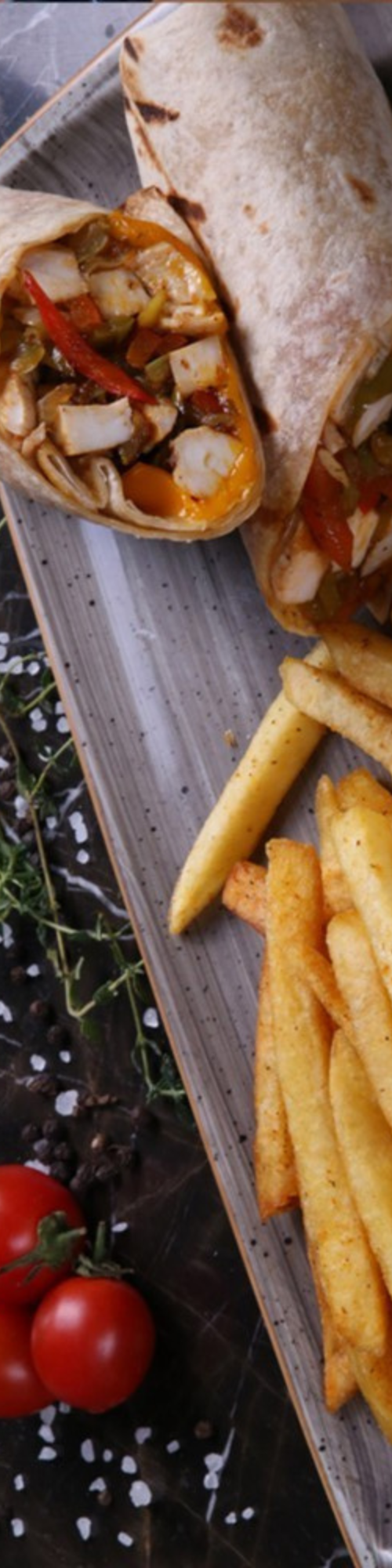 Tortilla Lavaşı Arasında 120 gr. Tavuk, Renkli Biber, Mantar, Peynir, Patates Cips ve Soslar Eşliğinde.